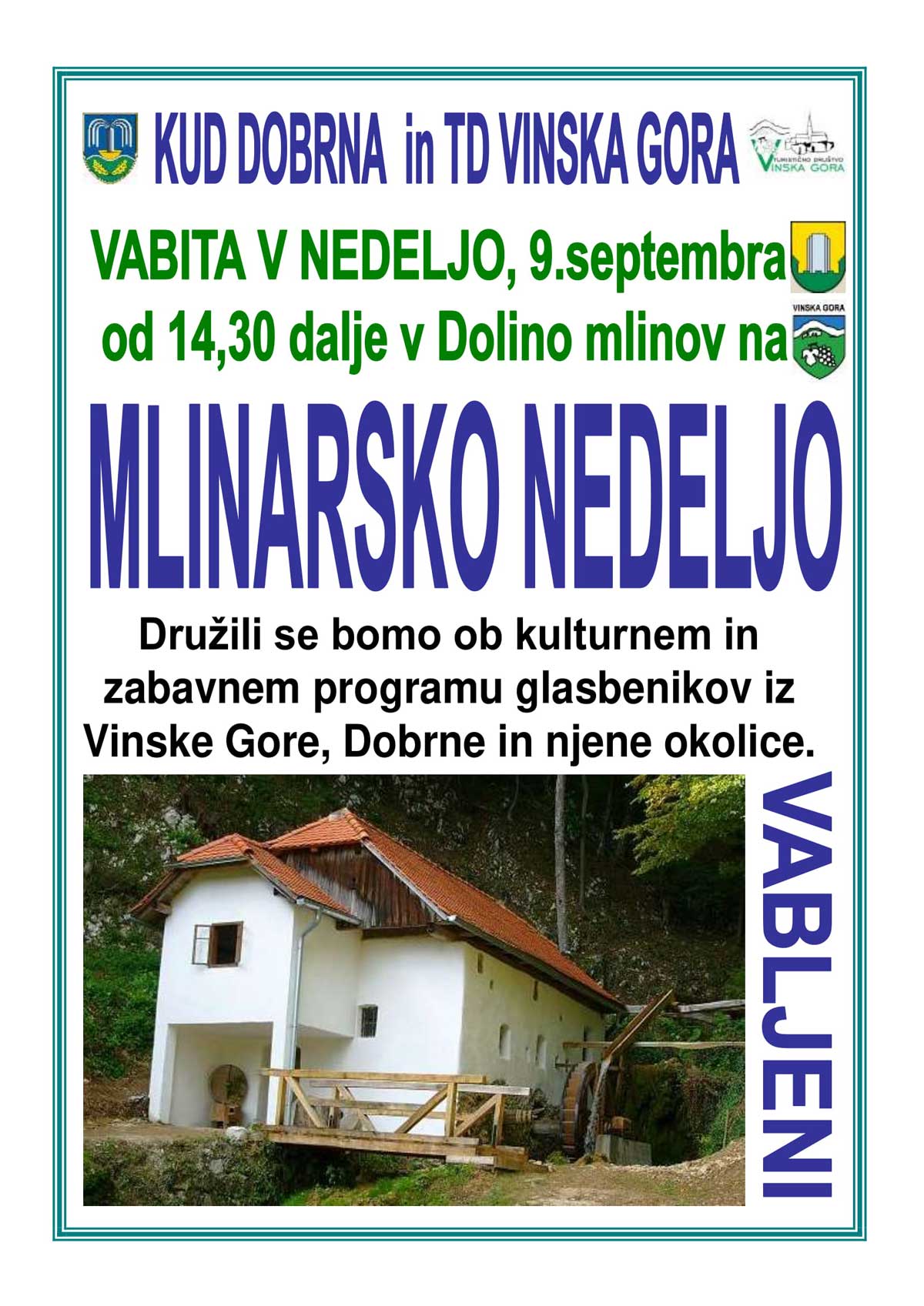 Vabljeni na 12. Mlinarsko nedeljo 0.0 Zadnja posodobitev: -/- Sorodne Novice: Uspešna Mlinarska nedelja 2023 Mlinarska nedelja 2023 Mlinarska nedelja in Biserjev vikend 2022 Pustna nedelja z Vingosi 2022 Pustna nedelja 2022 Mlinarska nedelja 2021 Mlinarska nedelja 13 Mlinarska nedelja Dan državnosti in Lepa nedelja 11. Mlinarska nedelja 0 Mlinarska nedelja
