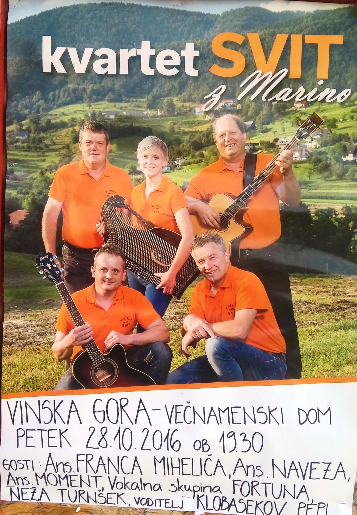 Ob 25 letnici delovanja, bo imel Kvartet SVIT z Marino v petek, 28.10.2016 ob 19,30 uri v Večnamenskem domu KONCERT. Predstavil bo tudi svojo novo zgoščenko. VABLJENI!!!!!